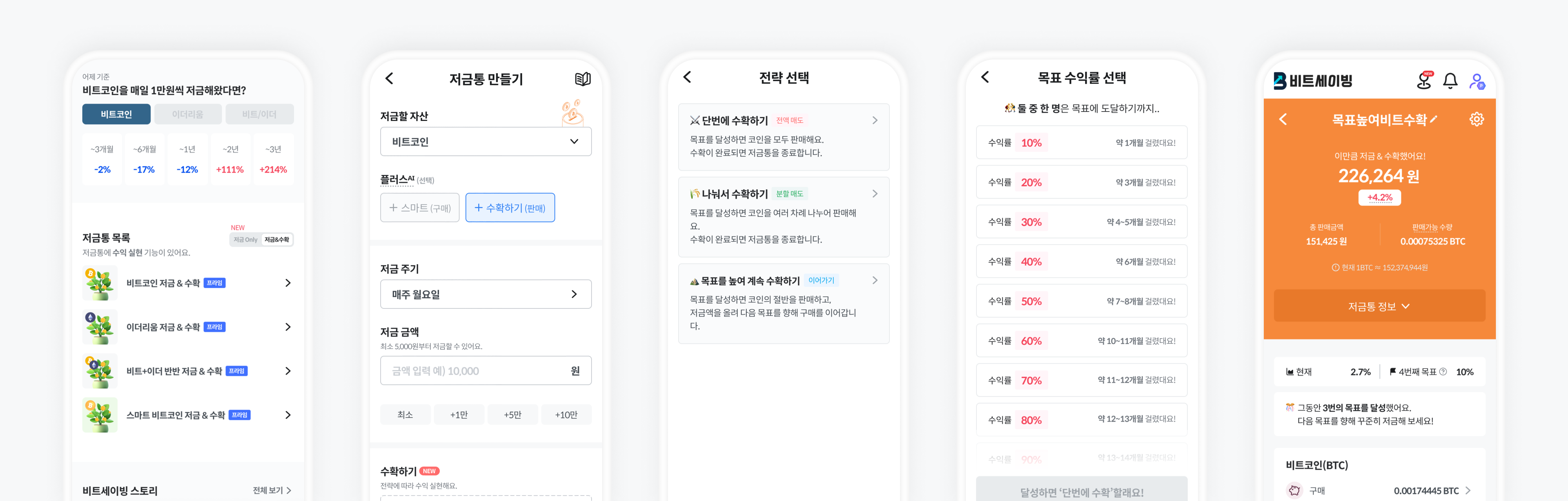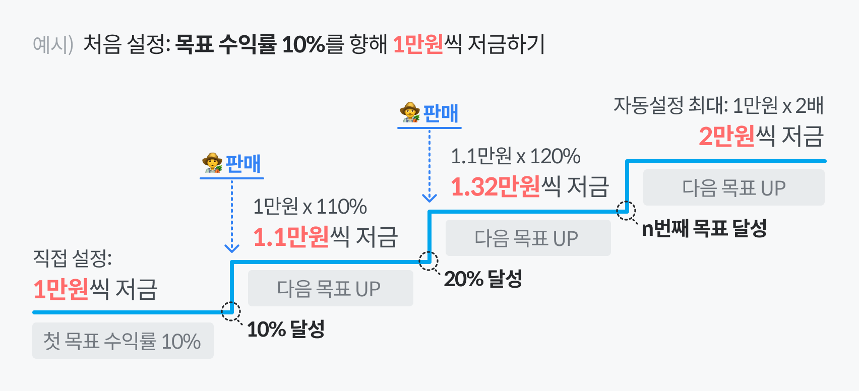 목표와 저금 금액을 단계적으로 높여 달성한 수익을 다시 구매에 활용해 다음 목표를 달성했을 때 더 큰 성과를 기대할 수 있습니다.