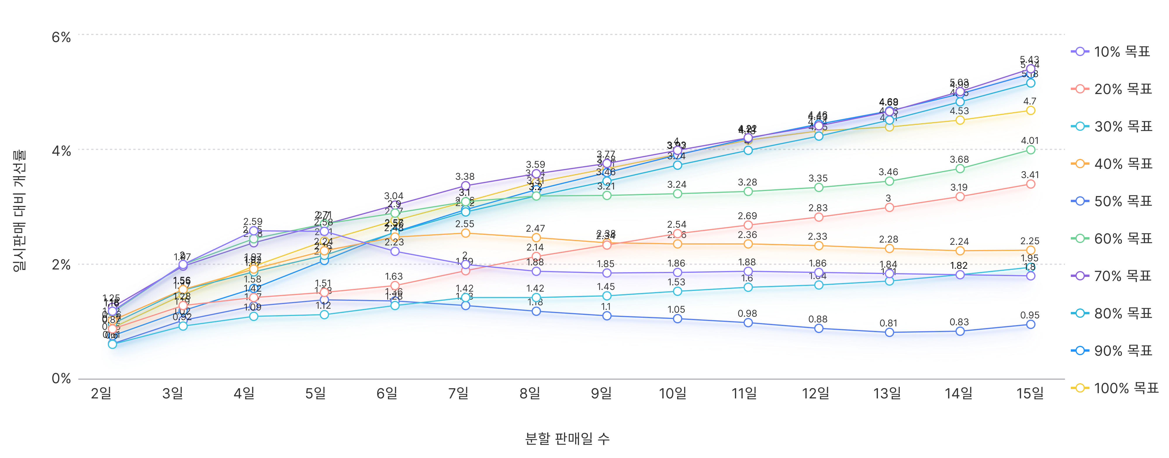 최근 가상자산 거래 데이터 중 시장 흐름에 따른 영향력을 제외하고 분석한 결과, 대부분의 경우에서 분할 판매 횟수를 늘릴수록 거래 당 평균 수익률이 점진적으로 개선되는 패턴이 나타났습니다.