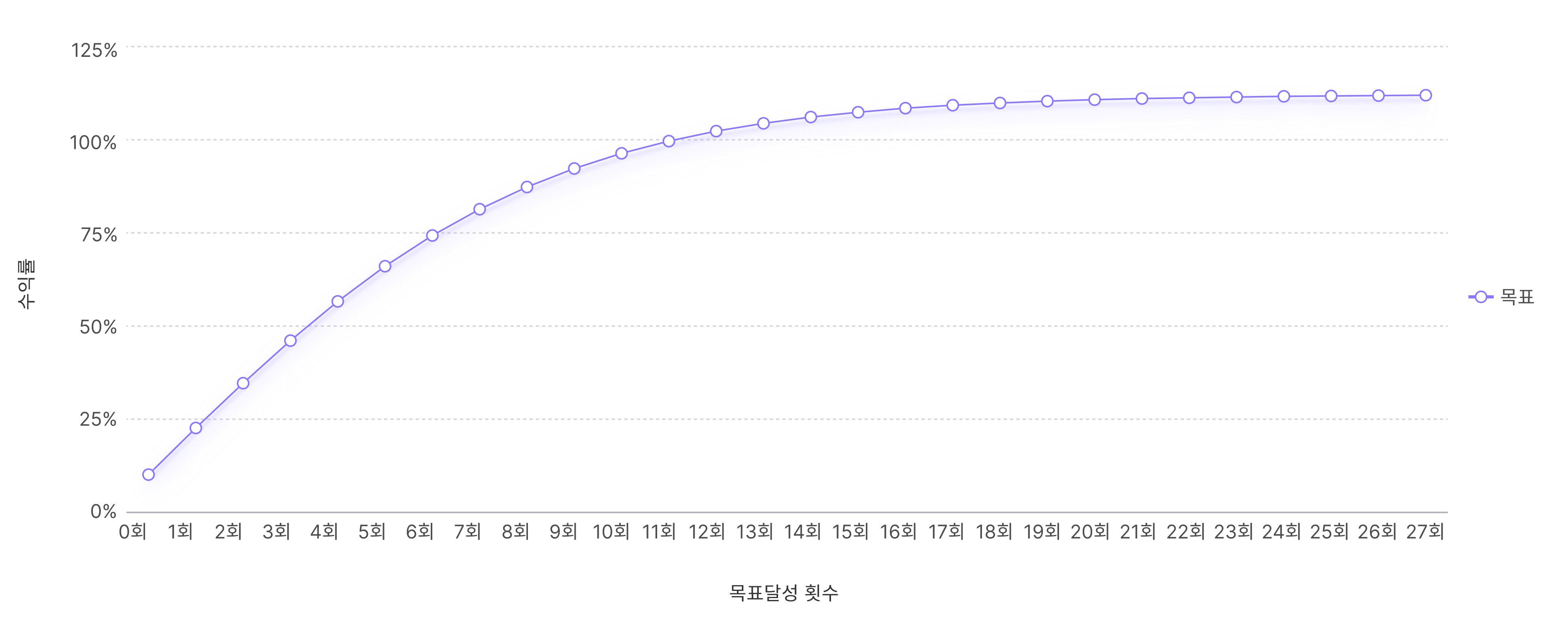 안정성과 성과를 균형 있게 유지하면서 직관적인 상승 기준(공식)을 찾기 위해 수많은 시뮬레이션을 돌려보았습니다. 그 결과 '현재 저금 금액(원) × 달성 수익률(%)'이라는 공식에 따라 저금 금액이 높아집니다.