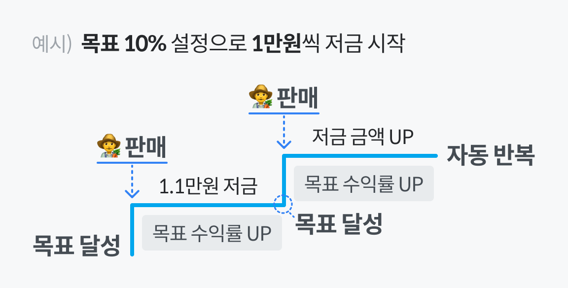 '수확하기'는 개개인의 목표에 따라 자동으로 판매를 실행하는 기능으로, 저금통을 만들 때 목표와 판매 전략을 고를 수 있습니다.