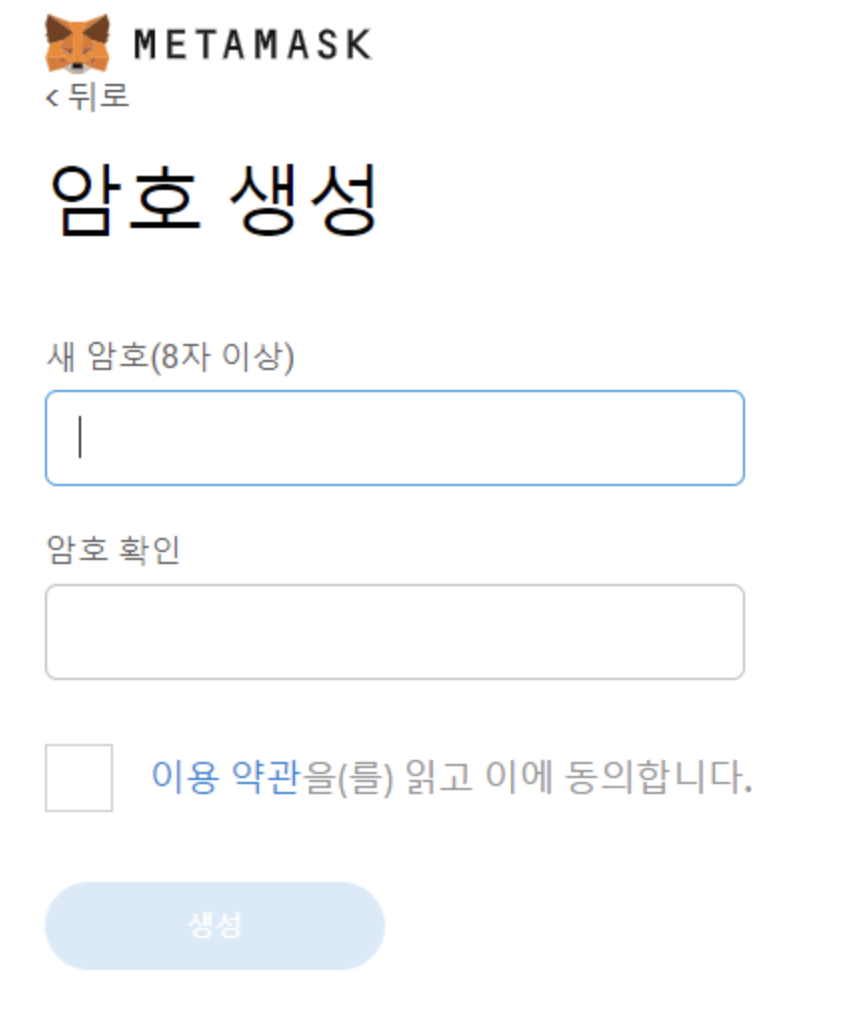 그다음 메타마스크 로그인에 필요한 암호를 설정합니다.