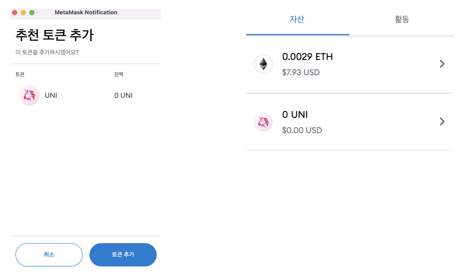 토큰을 추가하면 위와 같은 토큰 추가 창이 나타나고 토큰추가가 완료되면 메타마스크 자산 항목에 추가한 토큰이 나타납니다.