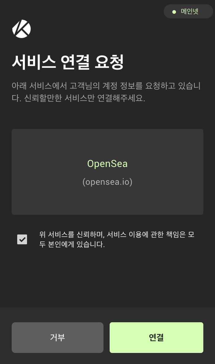 지갑 계정을 로그인하고 서비스 연결 체크박스를 활성화시켜 오픈시와 연결합니다.