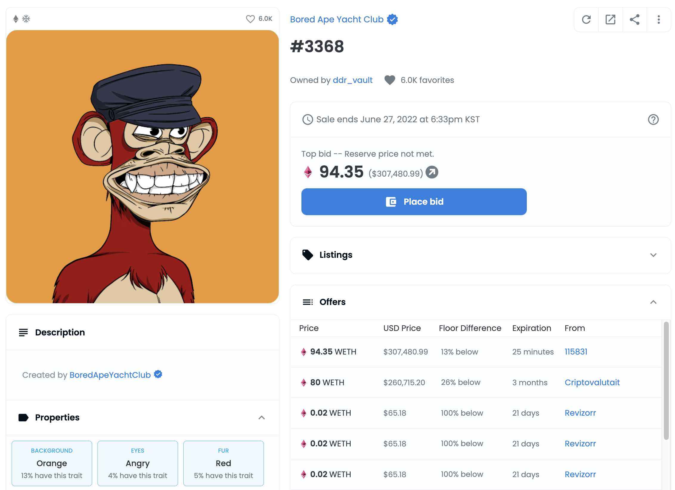 위 NFT의 최고 입찰가는 94.35 WETH이지만, Reserve price 보다 낮기 때문에 지금 경매가 종료되더라도 낙찰이 이루어지지 않습니다.