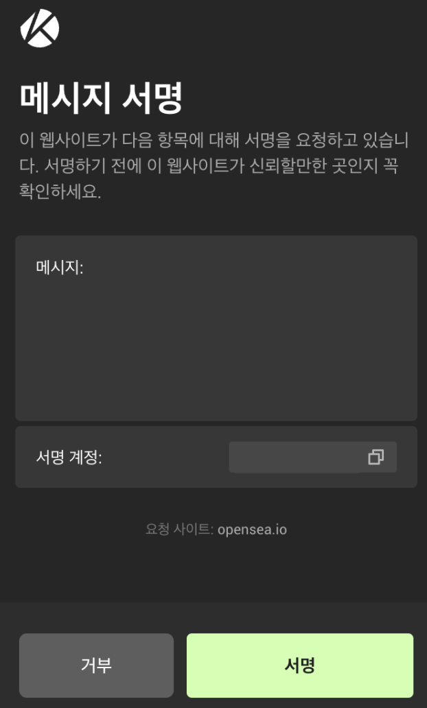 요청사이트가 오픈시 공식 사이트 주소인지 다시 한번 확인하고 지갑에서 '서명' 버튼을 눌러 지갑 승인을 진행합니다.