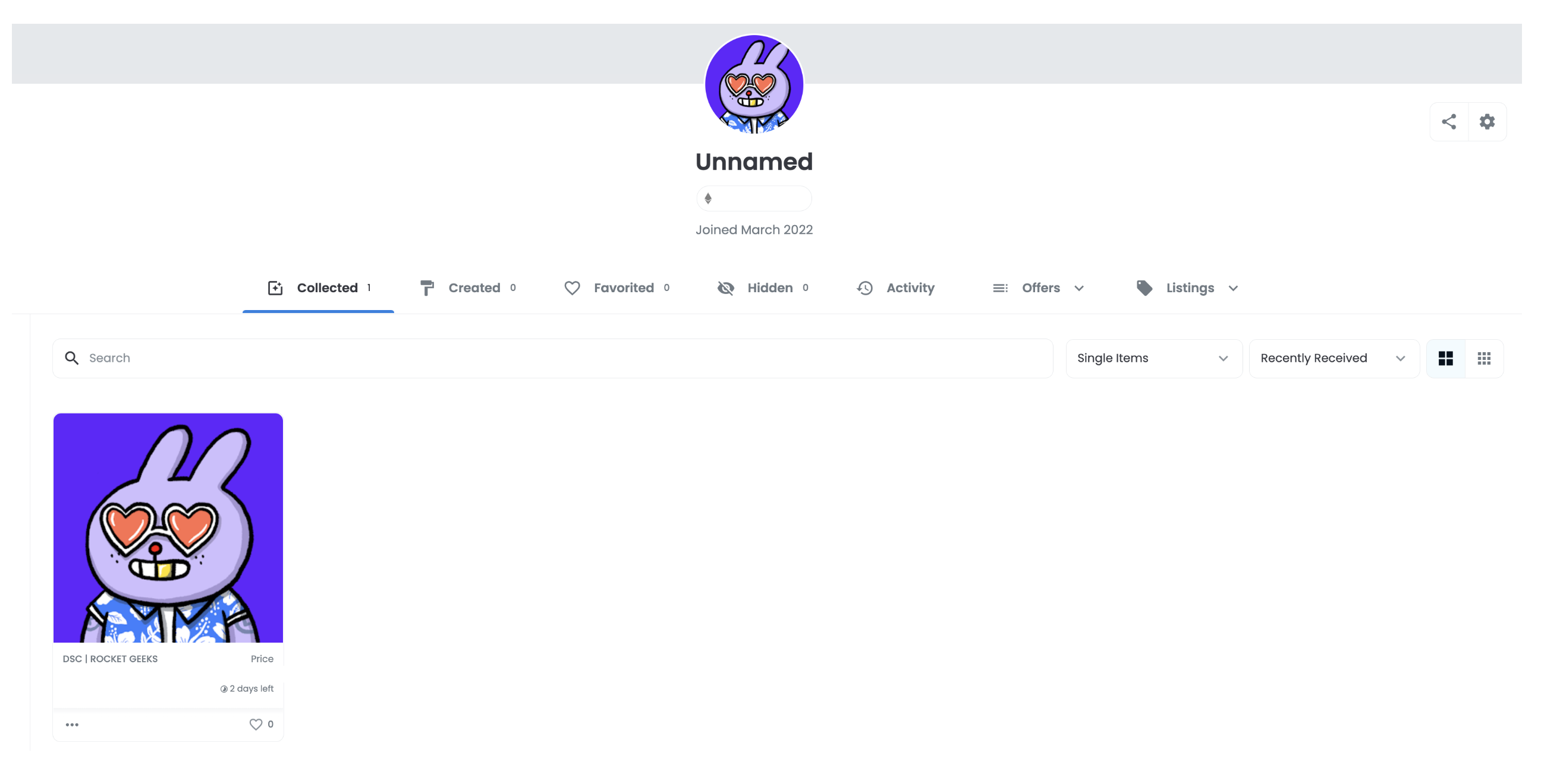오픈시와 지갑연결이 성공하면 위와 같이 마이페이지로 진입하게 됩니다.