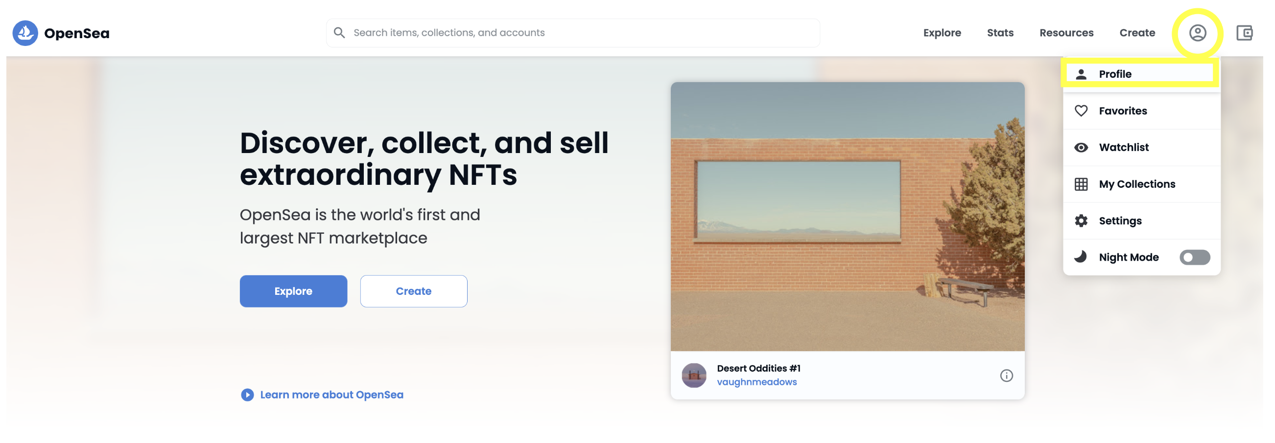 오픈시 페이지에서 우측 상단의 사람 아이콘 - Profile을 클릭하면 로그인 페이지로 진입할 수 있습니다.