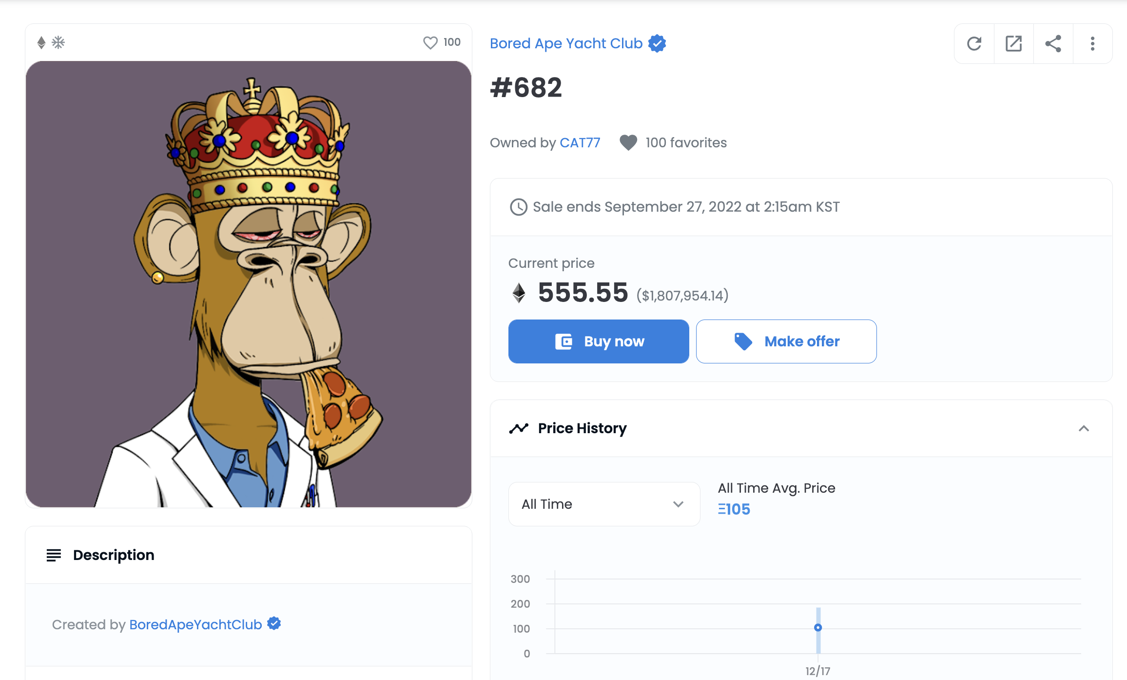 위 NFT는 지정가 판매 방식으로 등록된 NFT이며 Buy now, Make offer로 NFT를 구매할 수 있습니다.