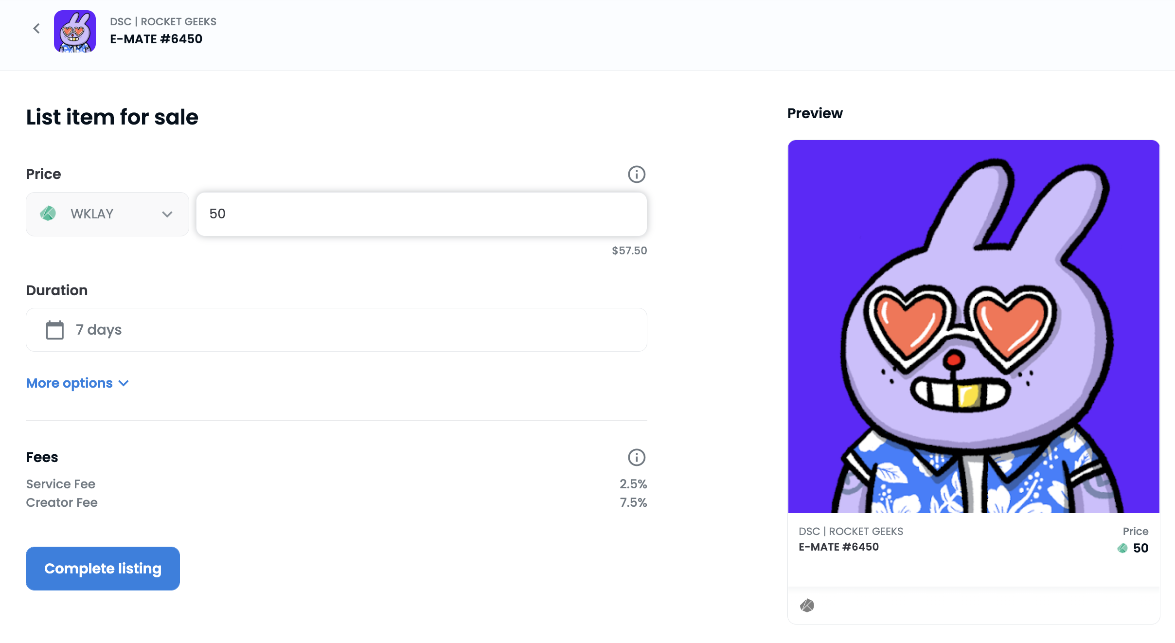| Price | NFT 판매 가격입니다. 위 NFT는 클레이튼 블록체인 기반의 NFT로 WKLAY 단위로 가격을 설정할 수 있습니다. |