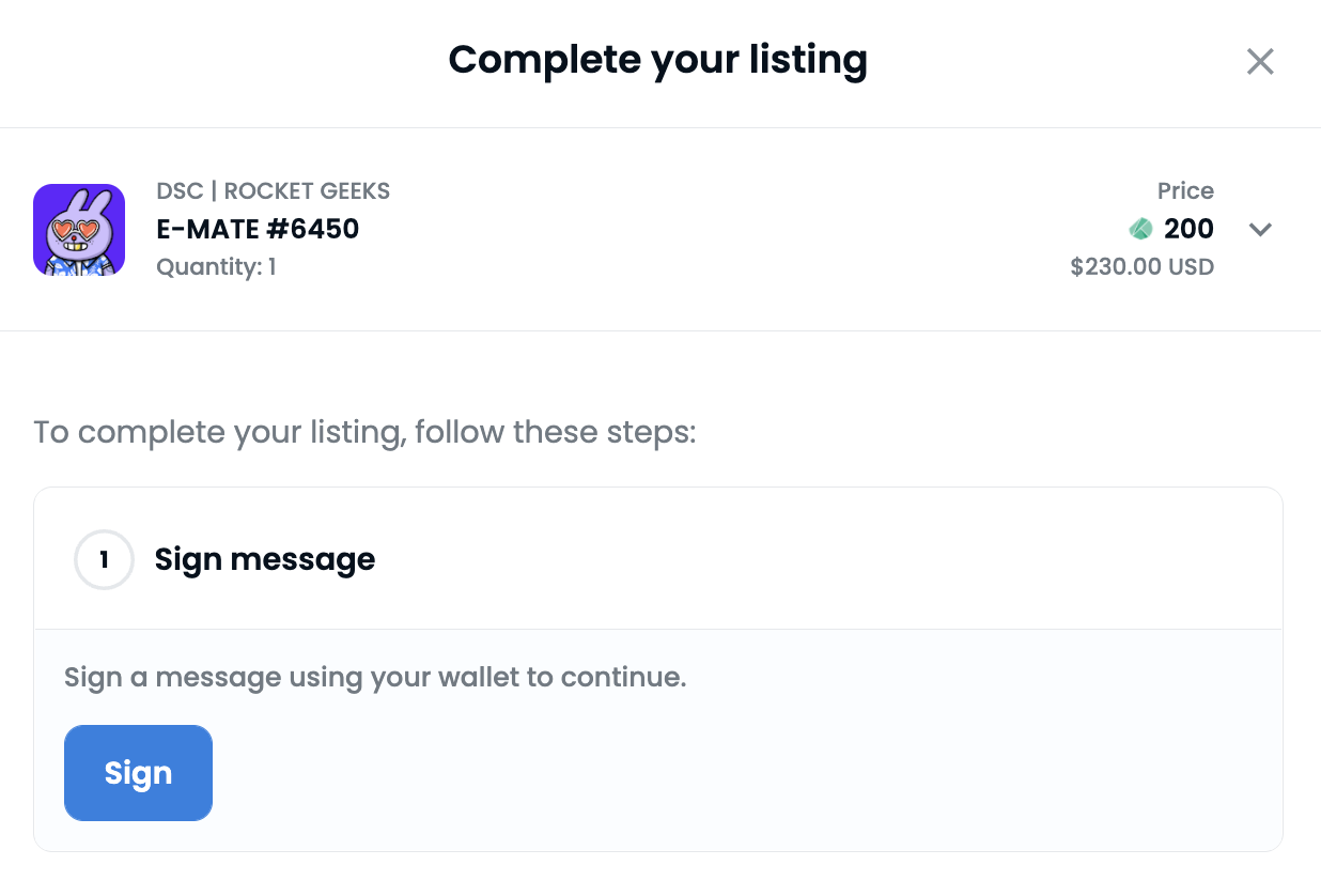 여기서 등록하려는 NFT와 가격을 다시한번 확인한뒤 'Sign' 버튼을 누르면 지갑 서명창이 팝업됩니다.