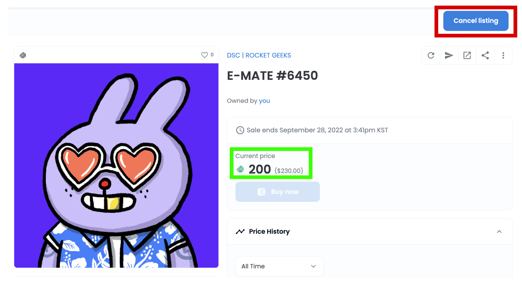 우측 상단에 위치한 'Cancel listing'을 클릭하면 판매 등록한 NFT의 판매 등록을 취소할 수 있습니다.