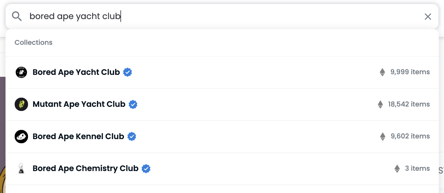 오픈시에는 유명 NFT를 사칭하는 스캠 컬렉션들이 다수 존재하니 검색할때 정확하게 명칭을 입력했는지 확인합니다.