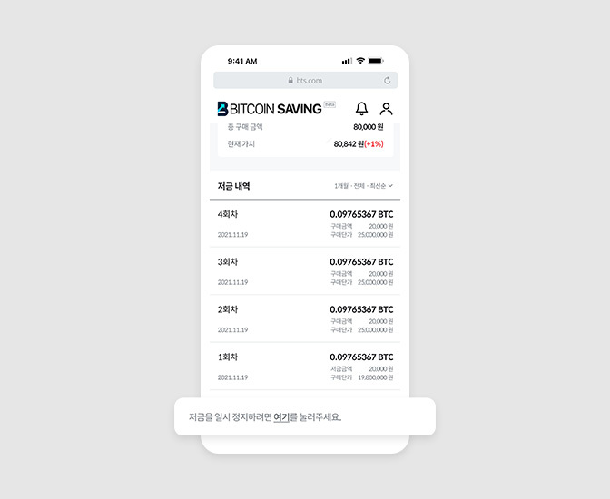 저금통을 잠시 멈추고 싶을 때, 저금 내역 맨 밑에서 일시정지할 수 있어요.