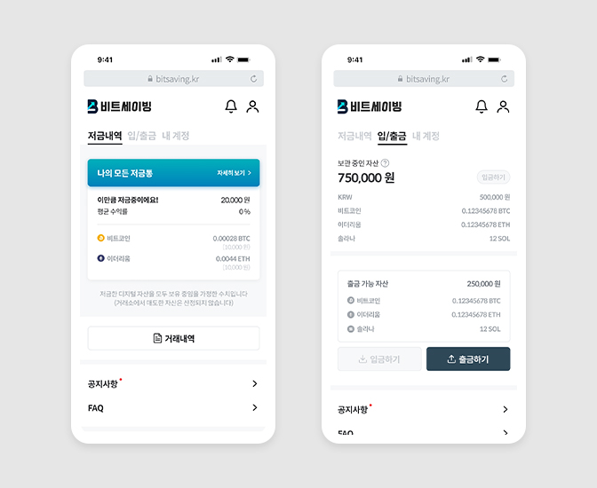 저금 관련 사항은 ‘저금내역’에서 확인하고, 비트세이빙에 보관중인 자산은 ‘입/출금’에서 확인하세요.