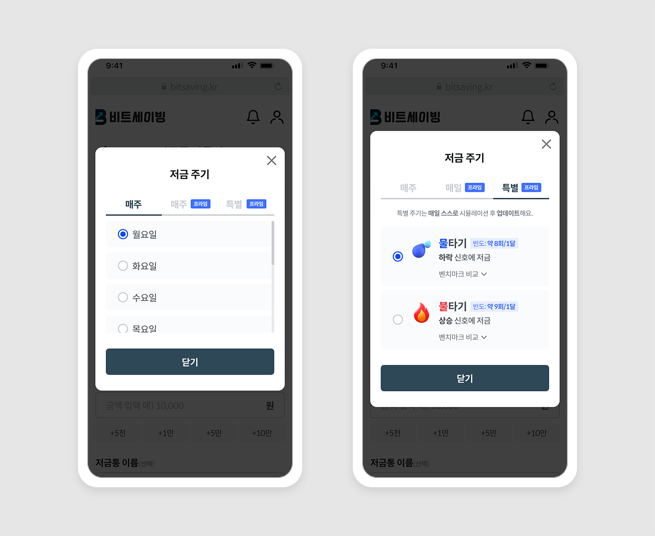 예) 비트코인의 가격이 4천만 원일 경우, 저금 금액을 7천 원으로 설정하면 0.0001개인 4천 원이 저금 되고, 9천 원으로 설정하면 0.0002개인 8천 원이 저금 됩니다.
