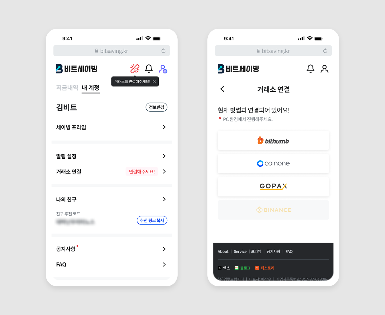 이제 고객님이 이용 중인 거래소 계정을 연결한 후 저금이 시작되기 때문에 거래소 계정이 꼭 있어야 합니다. 구매를 위해 거래소가 제공하는 API* 기능을 활용하며, 연결 방법은 [마이페이지] - [내 계정] - [거래소 연결]에서 확인할 수 있습니다.