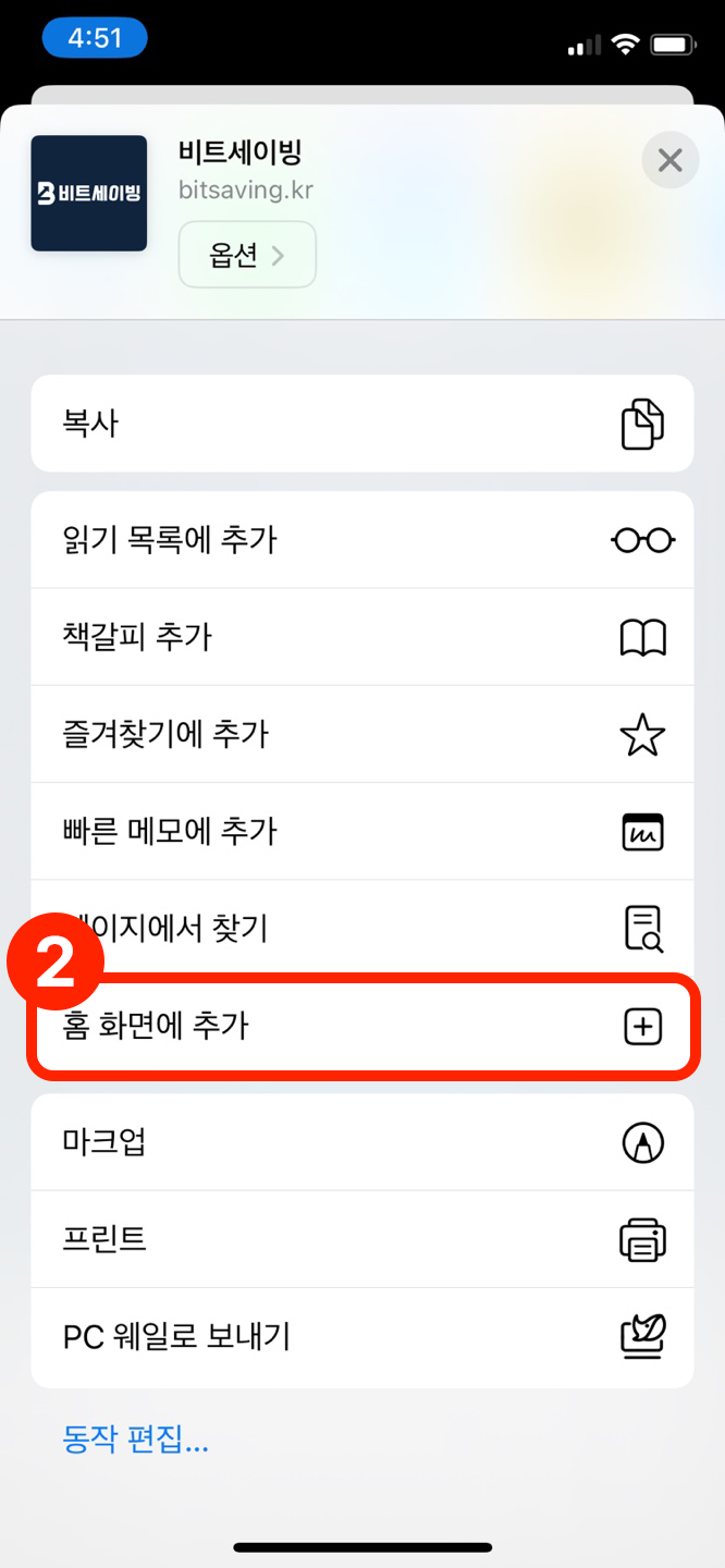 자료실 홈 화면 바로가기 추가(갤럭시, 아이폰) by 비트세이빙 2024. 2. 17. 비트세이빙 홈페이지를 스마트폰의 홈 화면에 바로가기로 추가해 놓으면 빠르고 편하게 접속할 수 있습니다. 아이폰 (사파리 기준) 갤럭시 (크롬) 갤럭시 (삼성 브라우저) 공유하기 게시글 관리 비트세이빙 Lab 저작자표시 비영리 변경금지 (새창열림) 댓글